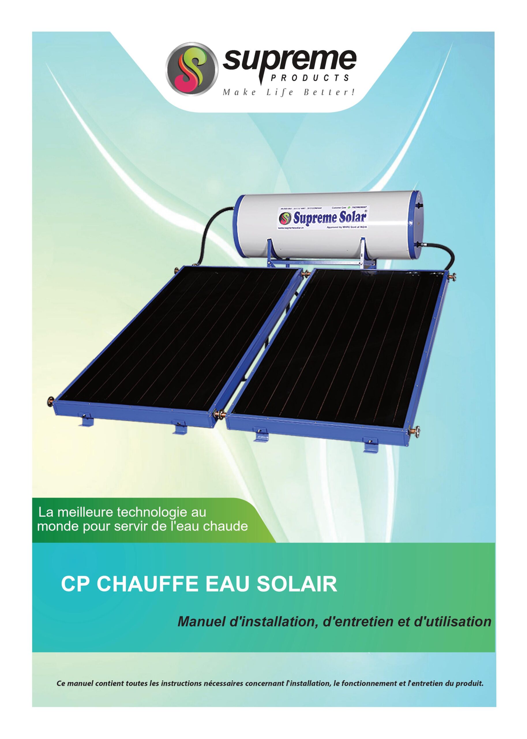 DESCRIPTION :——————————————————————————————————————————————–Notre gamme de chauffe-eau solaires SUPREME SOLAR est