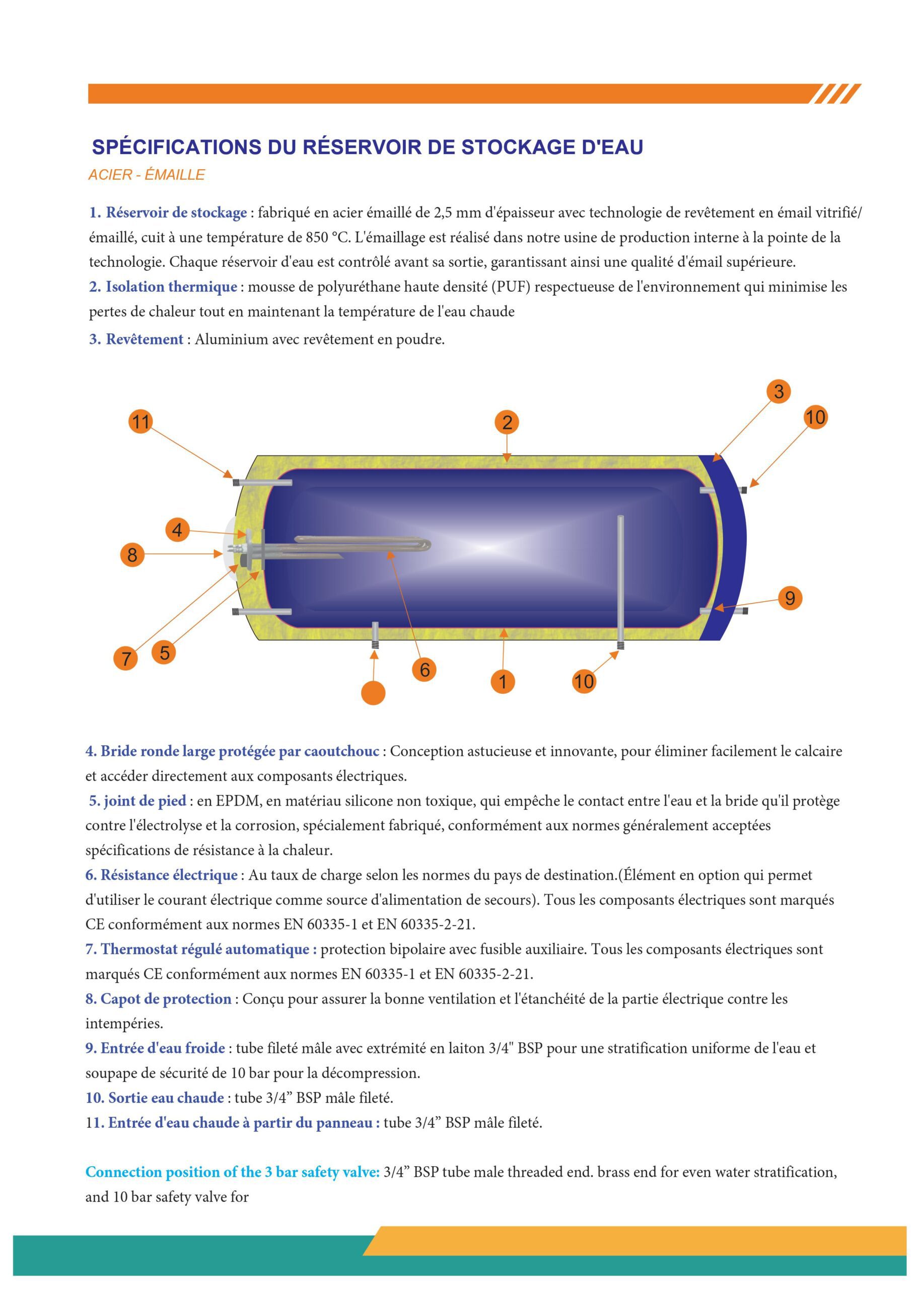 Connection position of the 3 bar safety valve: 3/4” BSP tube male threaded end. brass end for even water stratification, and 10 bar safety valve.